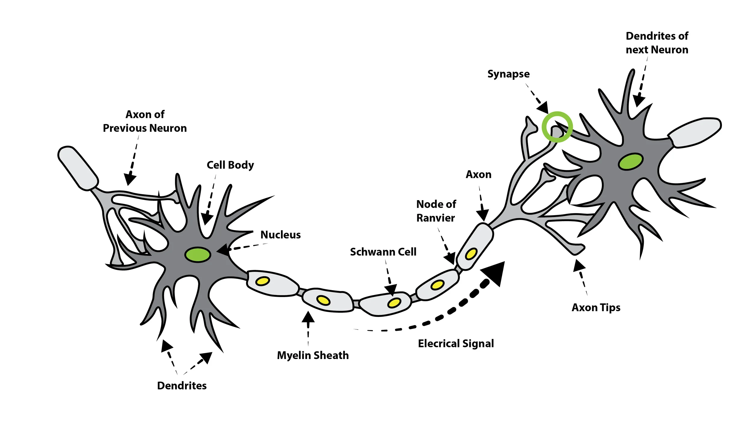 Neurons are signal generators in the brain which function as multi-input single-output logic gates. The inputs are known as dendrites, while the outputs are known as axons. When a neuron is stimulated it becomes excited and generates an action potential. The action potential propagates along the axon to stimulate the dendrites of the next neuron.